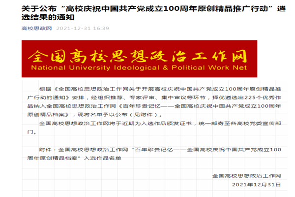 该作品入围由中共河北省委网信办、河北广播电视台主办的河北省“五个十”网络作品展示环节,入选教育部2022高校原创文化精品项目推荐名单,入选全国高校思想政治工作网《百年珍贵记忆——全国高校庆祝中国共产党成立100周年原创精品档案》。