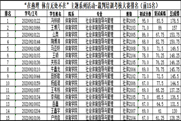 复试考核结束后,大赛组委会成员就前二十名参与学生的初试和复试成绩按占比统计后进行排名。最终,体育学院社体2005班冯林硕获得第一名,社体2103班王博凡获得第二名,社体2005班么奥获得第三名。