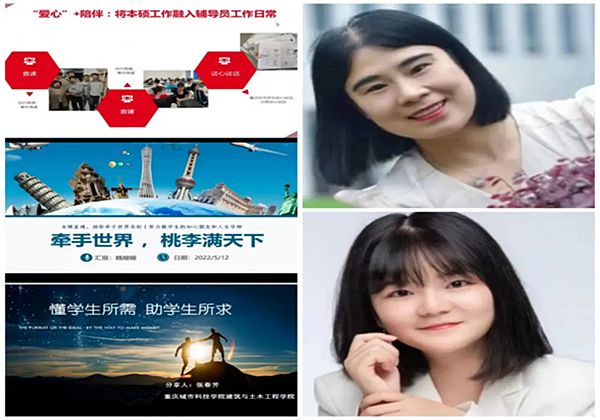 重庆城市科技学院建筑土木学院党总支书记王爽从“四位一体”、“五大建设”、“6+1”体系、“五维联动”四个方面进行了分享;刘晓梅老师围绕“爱心”、“细心”、“耐心”三心育才讲述了如何与学生沟通,并强调要陪伴、关注和支持学生的成长成才;魏珊珊老师从三“深”即“深入班级”、“深入宿舍”、“深入学生成长”和三“试”即“试分群体”、“试执计划”、“试一对一”来帮助学生走向世界。张春芳老师希望辅导员能秉承“高端化、国际化、个性化”开展办学,以高层次引导学生继续深造学习的新途径。