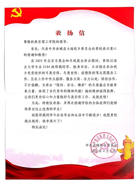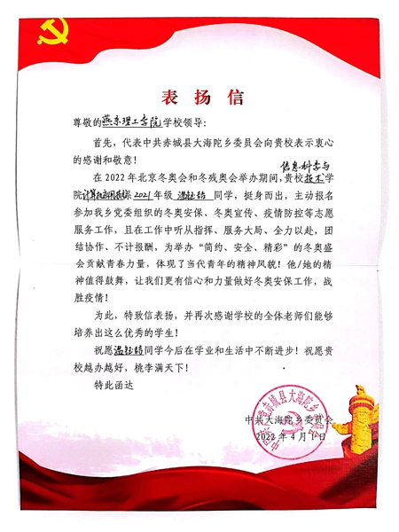 本网讯(记者 李家曾)日前,学校收到2封来自中共大海陀乡委员会的表扬信,信中对郑娟、温钰喆两名同学在其乡党委组织的冬奥安保、冬奥宣传、疫情防控等志愿服务工作中进行了肯定和表扬,称赞他们为冬奥盛会贡献了青春力量,体现了当代青年的精神风貌。表扬信原文如下: