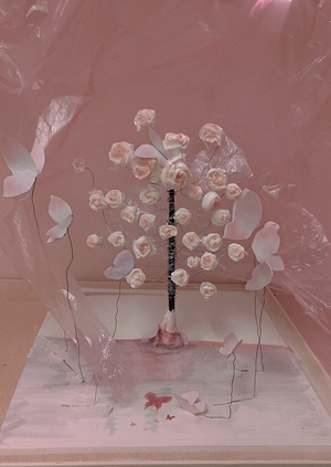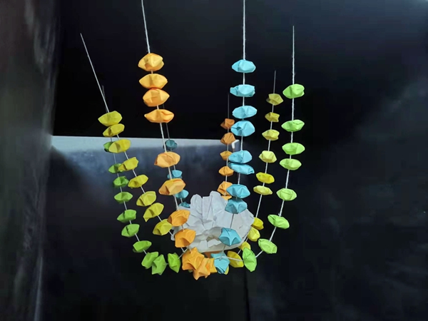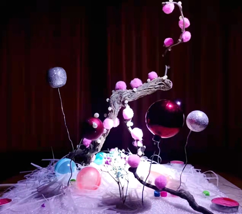 它的主体形是一个枯树枝,上面有用粉色的绒球和珍珠加以装饰,象征着枯树重新开花,预示着生机。中间主体下面有一个彩色的灯,寓意着胜利的曙光,灯在树下照耀着树干,给人以期待。预示着我们对待疫情,会坚持不懈,迎难而上,总有一天会突破疫情的阴霾。