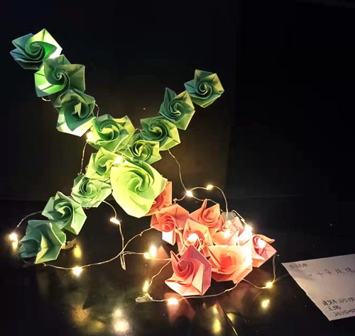 本设计是由十几个折纸玫瑰花构成。玫瑰花拼接成一个倾斜的”十字架”,周围环绕着一圈圈小亮灯。绿色是生命的象征,代表着生机,寓意春回大地、万物复苏。粉色玫瑰花可近似为用鲜血染成的花朵,意在表达对奋斗一线的医护人员的敬意,是他们用自己全身心的付出,护卫着整个国家和民族的生命安全。