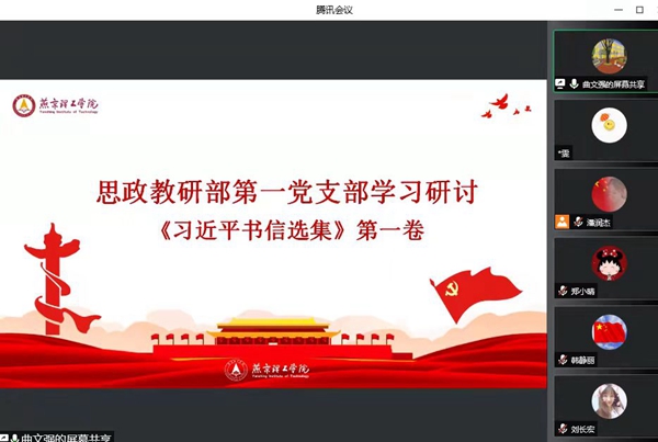本网讯(思政教研部 曲文强)4月13日,思政教研部党总支按照《中共燕京理工学院关于认真组织学习〈习近平书信选集〉第一卷的实施意见》(党发〔2022〕12号)要求,组织全体教师通过线上会议集中学习研讨《习近平书信选集》第一卷。思政教研部各党支部紧紧围绕习近平总书记重要讲话精神,认真学习《习近平书信选集》第一卷,结合思想政治理论课教育教学实际,展开了热烈研讨。