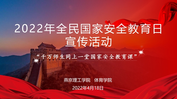 本网讯(体育学院 李强)2022年4月15日是第七个全民国家安全教育日,以“树牢总体国家安全观,感悟新时代国家安全成就,为迎接党的二十大胜利召开营造良好氛围”为主题,结合新时代法制宣传教育、国家安全观等有关文件精神,我校体育学院积极响应学校要求,开展2022年全民国家安全教育日宣传教育活动。