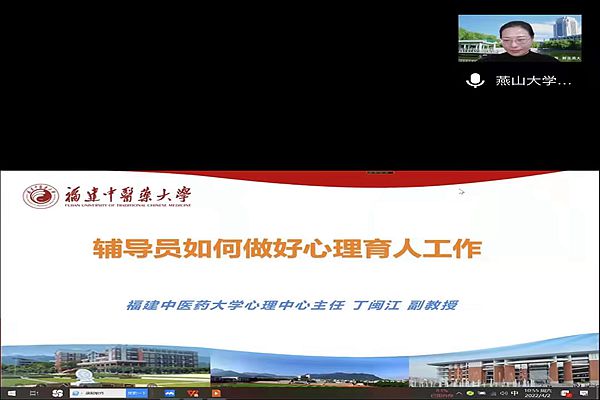 燕山大学党委学工部举办的“辅导员赋能苑”心理专场培训会,主要由福建中医药大学心理中心主任、副教授丁闽江主讲,讲座以《辅导员如何做好心理育人工作》为主题,并围绕辅导员教师应如何识别大学生心理问题及如何进行心理健康教育和突发事件的应对措施等方面进行深入讲解。