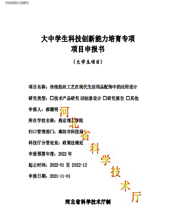 本网讯(艺术学院 武子锡)近日,2022年度河北省大中学生科技创新能力培育专项项目申报通过名单公布。我校此次共投递9个项目,四个项目通过立项,艺术学院申报成功两项,分别是沈宏院长带领的郝璐明组《传统掐丝工艺在现代生活用品配饰中的应用设计》和郑建楠副院长带领的刘喜月组《北京副中心一体化发展背景下燕郊社区健身器材使用现状的调查研究报告》。