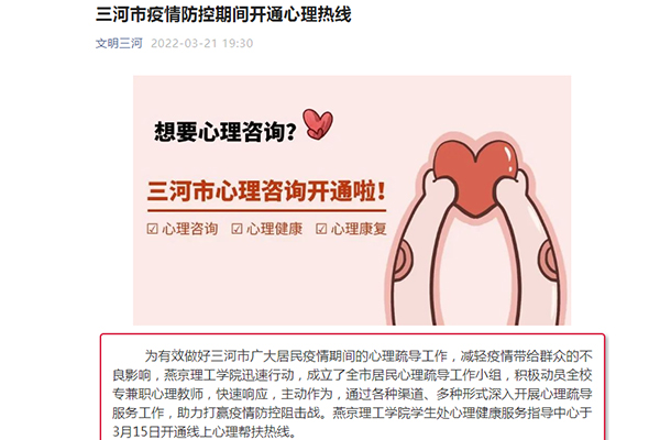 在廊坊疫情发生后,支部主动担当,积极作为,加强心理健康和人文关怀。针对疫情封闭期间,群众心理问题突发的现状,于3月15日开通线上心理帮扶热线。初期采用QQ线上咨询和固话接访两个渠道,在市委宣传部及文明办的帮助下,于3月20日新增两个移动接访端口,开启24小时轮岗值班制度。面向社会招募心理援助志愿者,截止目前学校心理教师连同招募的社会心理帮扶志愿者共计37人,咨询师公布私用手机号,供市民拨打,解决心理问题。同时启用心理中心学生干部作为学生志愿者,负责固话端分诊,固话接访时间为8:00—20:00,严重问题转诊咨询师,轻度问题转诊线上咨询。