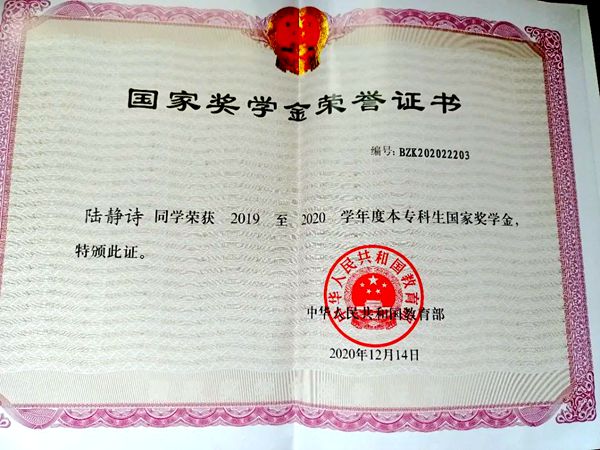 陆静诗说:“在成长道路上,学院教师为我的发展提升提供了很大帮助,她们给我学习上的教导、迷茫中的鼓励与犯错时的告诫,赋予我前进的动力和勇气。感谢学校与学院提供的各项比赛机会,让我得以丰富个人技能,锻炼自身能力,从而成为更好的自己!感谢五位活泼开朗舍友们,你们是我这一路走来最温暖的阳光。”