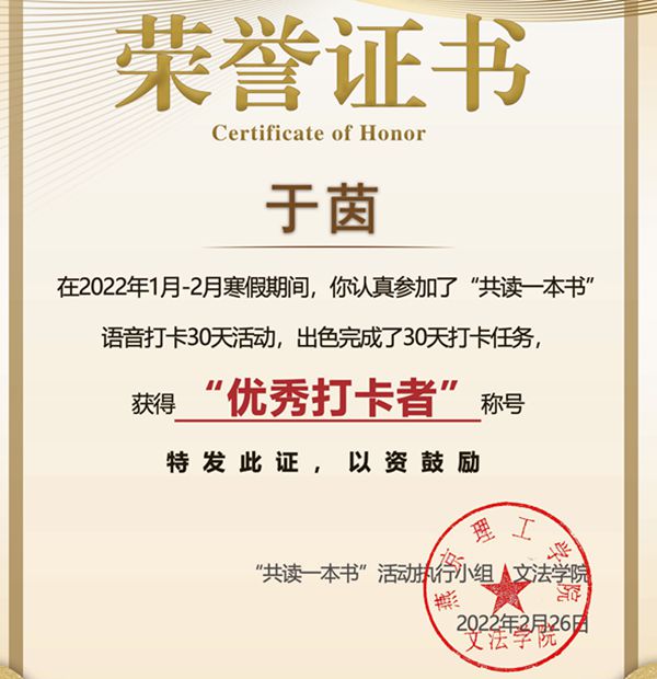 为积极响应我校关于进一步落实好第三轮“共读一本书”语音打卡活动倡议,鼓励我校师生在寒假期间积极打卡,坚持学习,“共读一本书”活动执行小组在寒假期间开展了寒假版“共读一本书”语音打卡30天活动。根据活动章程,寒假期间参与活动的老师和同学,在规定期间内完成30天打卡任务,经任课英语教师鉴定、审核打卡语音和记录截图后,符合活动规则即可获得专属电子荣誉证书。活动开启后,受到全校师生积极响应,寒假期间共计3000余人参与活动,其中1619人完成打卡30天任务并获得相应荣誉证书。