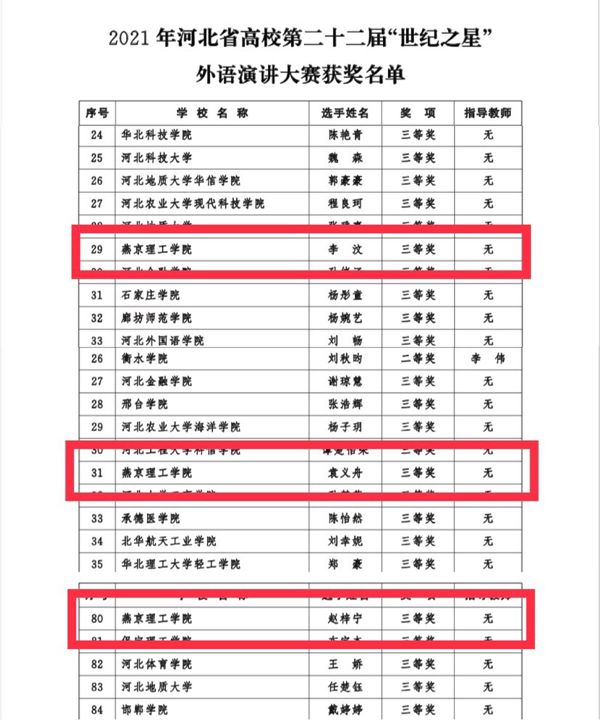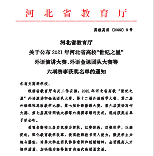 本网讯(文法学院 王妍)近日,河北省教育厅发布《2021年河北省高校“世纪之星”外语演讲大赛、外语金课大赛等六项赛事获奖名单的通知》。我校师生在多项赛事中斩获佳绩。