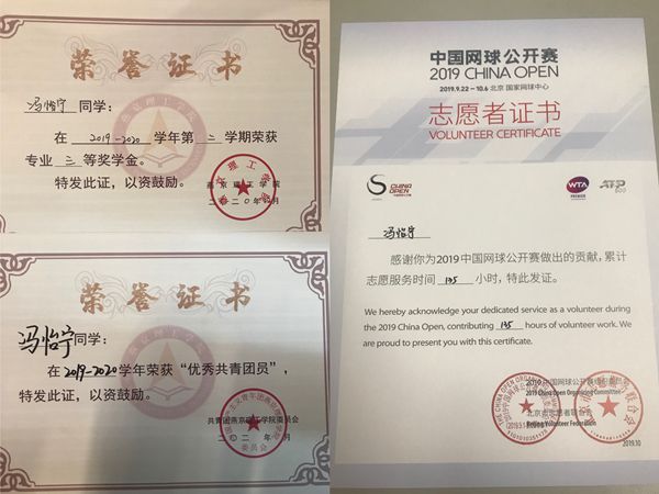 冯怡宁不拘于书本知识,学习之余,她常常参加活动,曾获北师大模拟联合国“参会证明”、北社管模拟联合国“最具风采奖”。为了拓宽眼界,她去各地博物馆游玩,领略中华文化,感悟人生哲理。冯怡宁根据自己的职业规划考取了银行从业资格证、人力资源管理师等各种证书,不断提升自身学习技能。她还注重自身全方位发展,在中国网球公开赛、北京天桥艺术中心莫扎特之友志愿活动中,都有冯怡宁的身影。疫情当下,她积极参加疫情防控志愿服务,成为石家庄裕华区抗疫志愿者,为家乡贡献自己的青春力量。