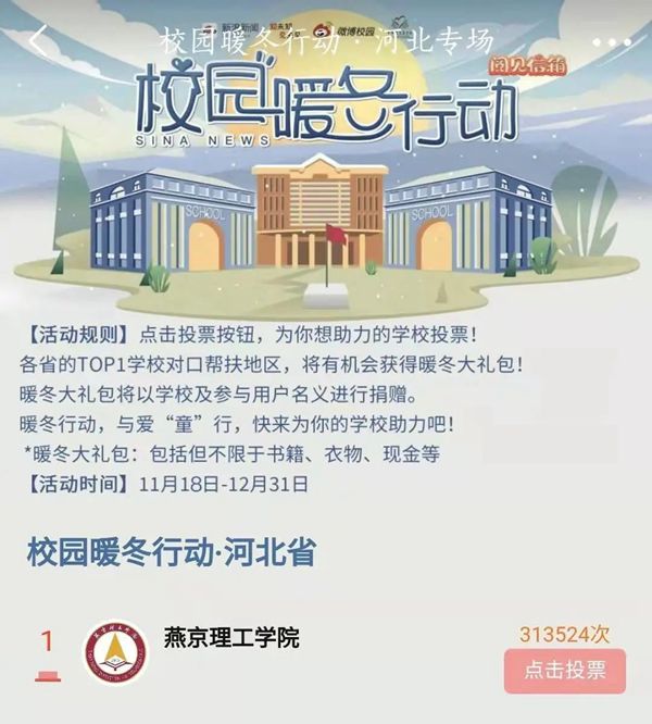 燕理有爱,“益”起参与。燕京理工学院携手微博校园发起暖冬行动后,受到了我校师生的广泛关注和参与,由师生党员牵头号召为活动投票,带动全体燕理人加入到乡村振兴的温暖传递中来。在动员会上,雷锋连连长郑涛为同学们讲述了自己曾经在平武支教的经历,他表示,志愿活动无大小,最重要的是将大家的参与度最大化,将希望与爱真正播种到大山深处,为那些可爱的孩子们送去冬天的温暖和社会的关爱,为乡村振兴尽一份自己的微薄之力。