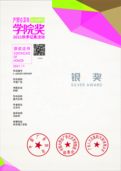 本网讯(艺术学院 视觉传达教研室)近日,在大广节学院奖颁奖典礼中,我校辅修视觉传达设计专业的王艺兴同学作品《星月幻海》荣获赛事银奖。