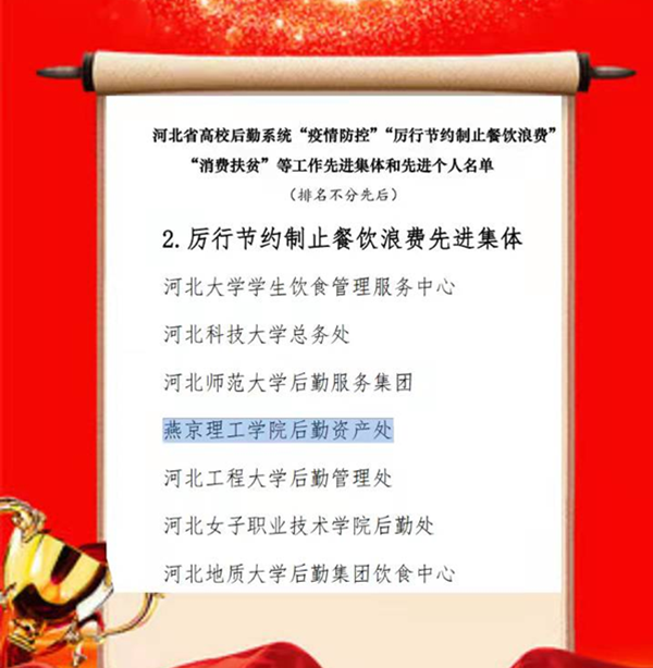 本网讯(后勤资产处 梁哲)2021年,学校后勤资产处在厉行节约制止餐饮浪费工作中牢记初心使命,坚决杜绝校园浪费行为,被河北省高等教育学会评为河北省高校后勤系统“厉行节约制止餐饮浪费”先进集体。本次表彰既是对燕京理工学院长期坚持厉行节俭反对铺张浪费工作成果的认可,也是对燕理后勤开展“光盘行动,厉行节约”工作的充分肯定。