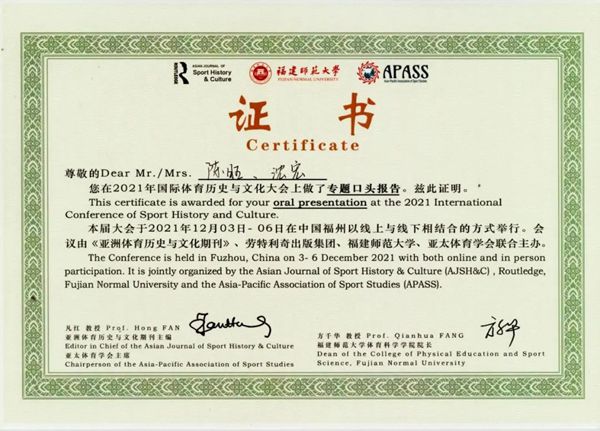 本次会议以奥林匹克运动和奥运会在亚洲的发展状况及其对体育的影响为主题,由亚洲体育历史与文化期刊(SSCI检索)、福建师范大学、亚太体育学会主办,由福建师范大学体育科学学院承办,在大会开幕式之后,来自世界各地200多名海内外专家学者对体育史和体育文化方面的研究成果进行了4 场主报告和12个分会场报告,共吸引了两百多名海内外专家学者参会。我校沈宏院长、陈旺老师在会议报告演讲中提出在冬奥背景下,如何将张家口地域文化与旅游的结合进行深入的分析和研究,探讨了将张家口草原文化、边塞文化、商旅文化、冰雪文化与奥运体育历史文化更好地融合以及进行冬奥文创开发等。该报告内容丰富,对张家口文化历史产业与文创开发研究提供了详实的数据实证,获得与会国内外专家的一致好评。