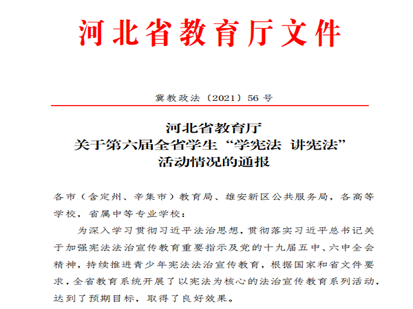本网讯(学生处 李阳 段梦虎)近日,由河北省教育厅、司法厅和法治宣传教育领导小组办公室联合举办的第六届河北省大中小学生“学宪法、讲宪法”大赛暨全国选拔赛在石家庄举行。我校在“宪法卫士”行动计划中获得优秀组织单位奖,老师宋子瑶、胡海春在省级比赛中被评为优秀指导教师,李颖、麻世杰同学分别在宪法法治竞赛、“学宪法,讲宪法”主题演讲比赛中荣获二等奖和三等奖。