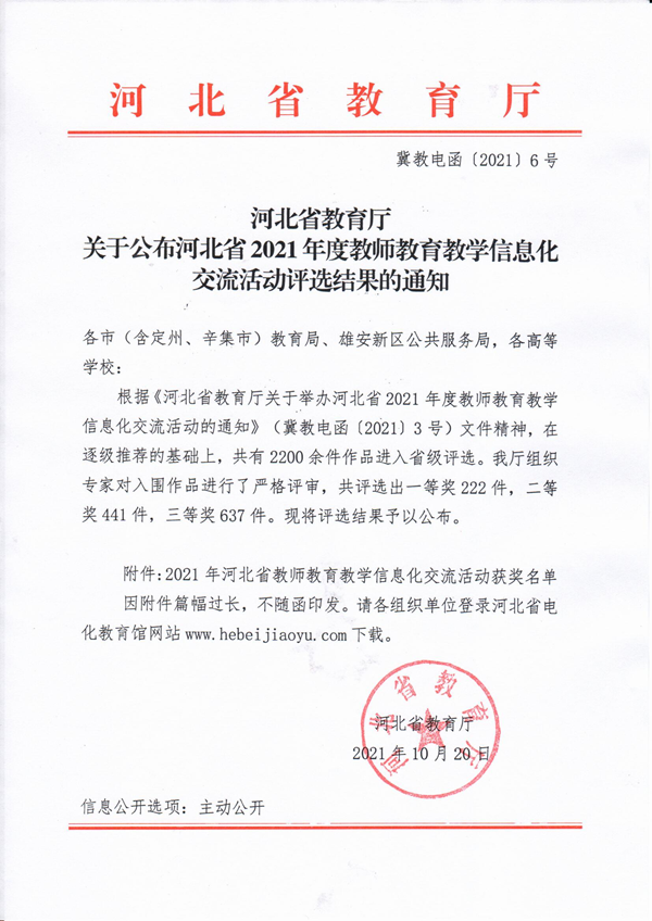 本网讯(教务处 李丽荣)10月20日,河北省2021年度教师教育教学信息化交流活动公布获奖项目名单,我校七个教师参赛项目分别荣获一等奖、二等奖和三等奖。