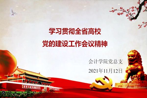会计学院学生第一党支部代表王洪雨老师、学生第二党支部代表冯云珠老师、教工党支部代表李晓硕老师、学生党员代表李泓静带领师生一起学习贯彻全省高校党的建设工作会议精神。
