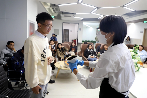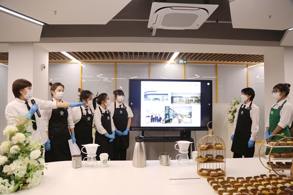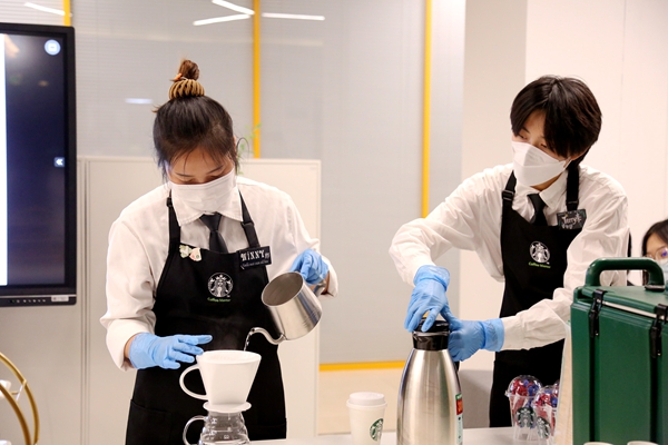 星巴克咖啡师Judy简单讲述了咖啡的起源、不同种类咖啡的出现时间以及咖啡的制作、研磨、冲煮等流程方法,并针对人们对于咖啡的认知小盲区进行解读。随后,星巴克咖啡师们展示专用手冲咖啡的制作器具,当场演绎咖啡冲煮技术,并为同学们现场分发咖啡。同学们在亲身体验烘焙咖啡芳香的同时,深度领略咖啡文化。