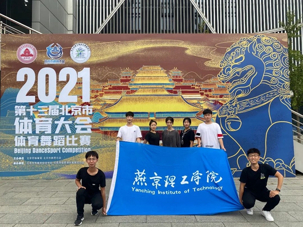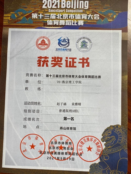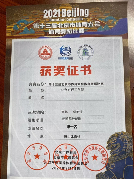 本网讯(文法学院 王俊棠)9月19日,由北京市体育局、北京市体育总会主办,北京市体育总会秘书处、北京市健美操体育舞蹈协会、北京市地坛体育馆承办的第十三届北京市体育大会体育舞蹈比赛在北京市燕山体育馆开赛。文法学院社会体育指导与管理专业教师蒋帅带领8名同学参赛,喜获佳绩!