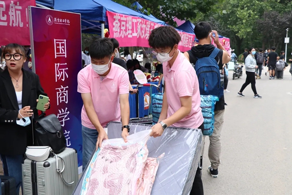 迎新前一天,国际商学院的志愿者们便开始了紧张的迎新现场布置,搭帐篷、贴横幅、调试迎新系统……有条不紊的为国商2021级新生们打造一场难忘的“大学第一站”。18日早上6点,国商志愿者们准时到位,再次对迎新现场进行了检查,确保万无一失、不落一人。国际商学院院长廉国恩、党总支书记贾思博来到迎新现场,全天候进行指导工作。院领导表示迎新工作是学校工作的重中之重,应从新同学角度出发,切实保障好新生入学相关事宜。同时对辛勤在岗的志愿者们表示鼓励和衷心的感谢