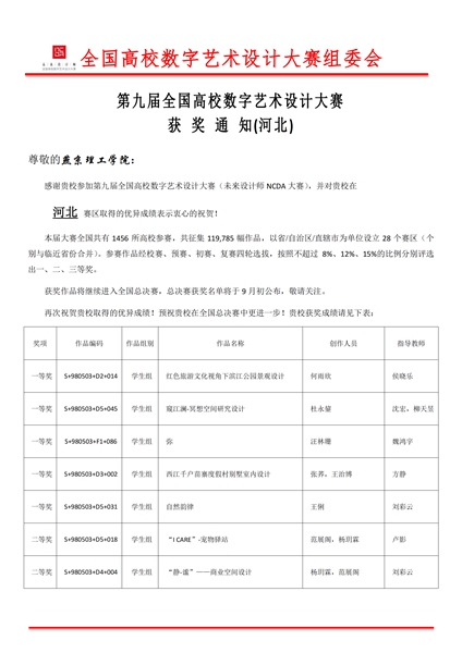 “以赛促学”是我校培养模式中的重要一环,艺术学院将继续鼓励并支持学生参与国内外专业赛事,提高自己的专业水平,展现燕理学子良好的精神风貌和专业实践能力,为学校赢得更多荣誉。