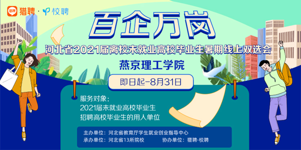 学校根据《教育厅学生就业创业指导中心关于开展“百企万岗”河北省2021届离校未就业高校毕业生暑期双选会的通知》(冀教就创函〔2021〕19号)有关工作部署,为促进离校未就业高校毕业生尽快落实就业,用心用情用力持续做好毕业生就业服务工作,切实做到“离校不离心,服务不断线”,为离校未就业毕业生再送一程,力争实现更多毕业生高质量、充分就业,特别开展此次暑期线上双选会。