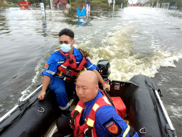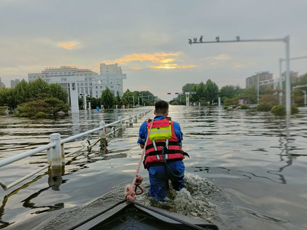 7月21日,我们第一站去的是郑州中哞县,主要任务负责转移酒店、医院和学校里的被困人员,同时完成现场搜救任务。作为先行“探路者”,早晨五点多我和几名队员率先到达,里面的路都是我们蹚出来的,没水的地方我们抬着船走,水浅的地方我们拽着船走,到了水没过腰的地方船才能开起来。从我们开始抬船到能开船的地方大约有五公里左右,我们几个人就这样泡在水里蹚了一个多小时,边走边摸路……