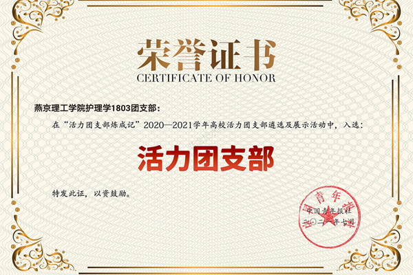 在三年的拼搏中,护理学1803团支部不忘初心,砥砺奋进。2人荣获三河市优秀共青团员称号,2人荣获省级三好学生称号,1人荣获国家奖学金,3荣获国家励志奖学金,2人获得一等奖学金、5人获得二等奖学金、9人获得三等奖学金、共发展党员3名。2018-2019荣获“优秀团支部”荣誉称号、2019-2020荣获班级风采大赛二等奖、2019--2020荣获“五四红旗班”集体荣誉称号、2019--2020荣获校级“优良学风班”荣誉称号、2020--2021荣获“河北省先进班集体”荣誉称号、2020--2021“优秀团支部”荣誉称号、2021年“挑战杯”河北省大学生课外学术科技作品竞赛红色专项活动作品《缅怀先烈-追寻红色印记 传承红色精神》荣获三等奖、2020-2021学年高校活力团支部荣誉称号。