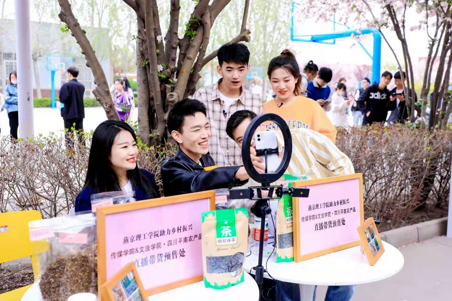 在得知这一情况后,燕理传媒播音专业的朱竟一、陈泽洋同学,决定放弃在海棠文化节上表演的机会,通过自己的专业特长,在海棠文化节上开启了直播带货。为平南的朋友们卖起了蘑菇、茶叶、蜂蜜等农产品。