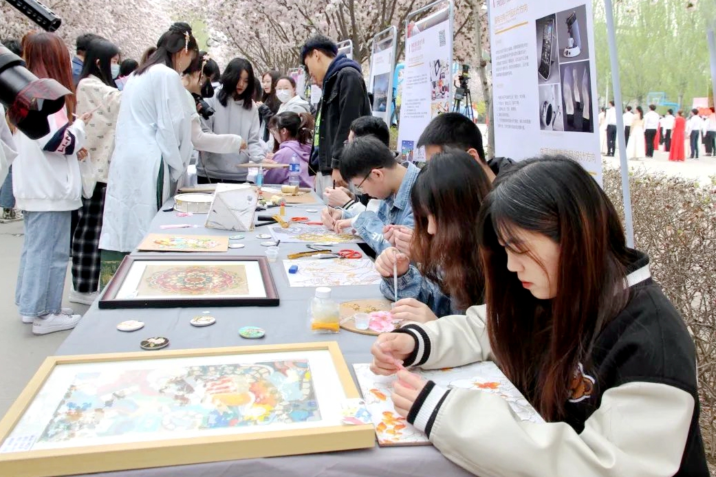 4月10日, 艺术学院展示主题为“海棠燕理,最美艺术”,映入眼帘的是《造型基础》等专业基础课与党建、思政相结合的绘画作品,充分展现了艺术学院学子的青春活力和艺术风采,同时表达了对党的尊敬和对祖国的热爱之情。海棠花的美丽稍纵即逝,艺术学院产品设计师生用传统掐丝工艺技巧和填砂方式,让海棠花永远灿烂。师生团队精心准备金丝线和釉料等物料,邀请同学们实操演练。珠宝首饰设计师生以海棠花为基础,用缠花技法制作出精美的工艺饰品,记录海棠花的鲜艳夺目。