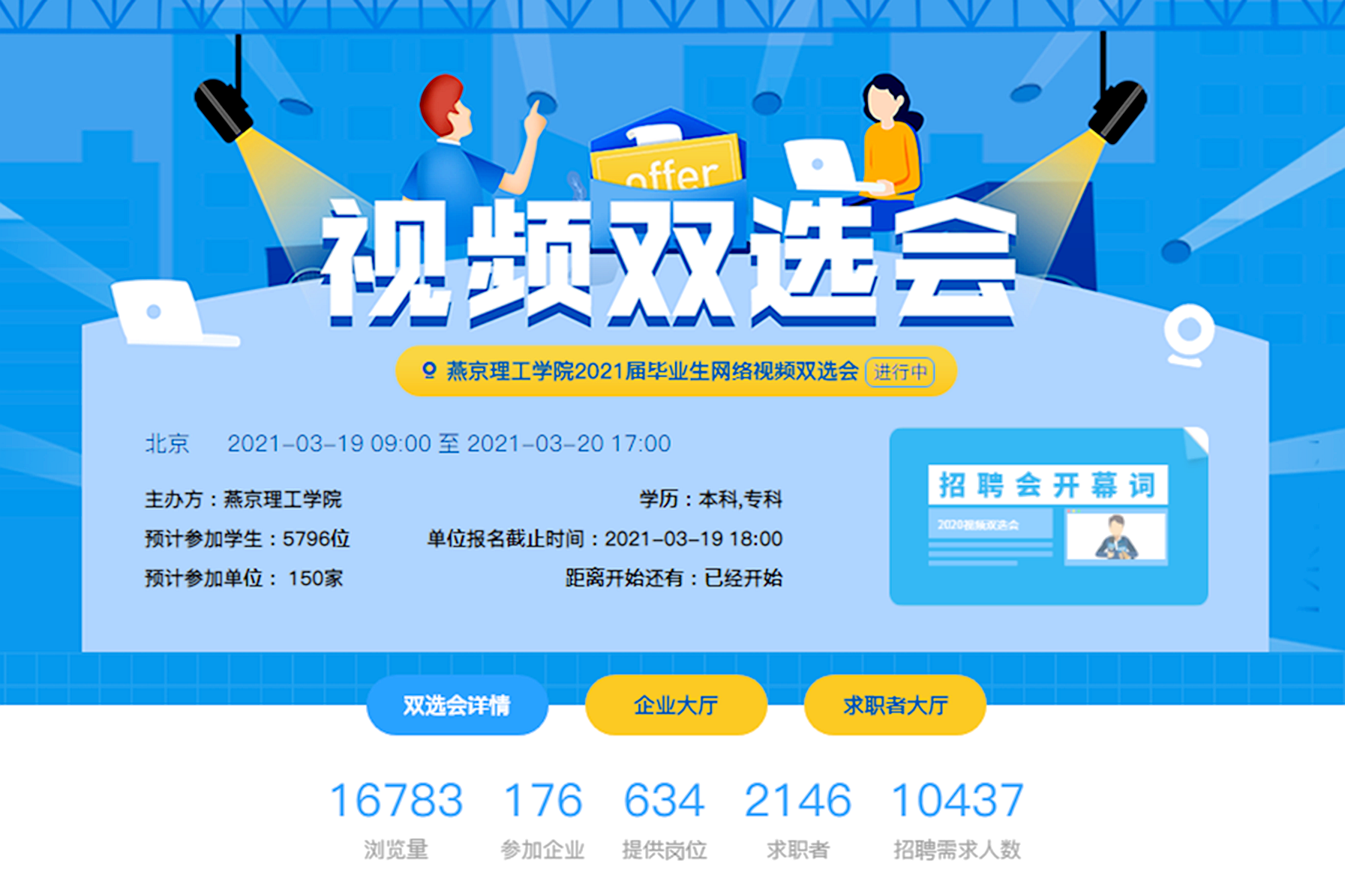 3月19日、20日,学校举办了“2021届毕业生网络视频双选会”,旨在深入贯彻落实党中央、国务院“稳就业”“保就业”决策部署,在疫情防控常态化时期促进学校2021届毕业生顺利就业,同时满足各用人单位的招聘需求。