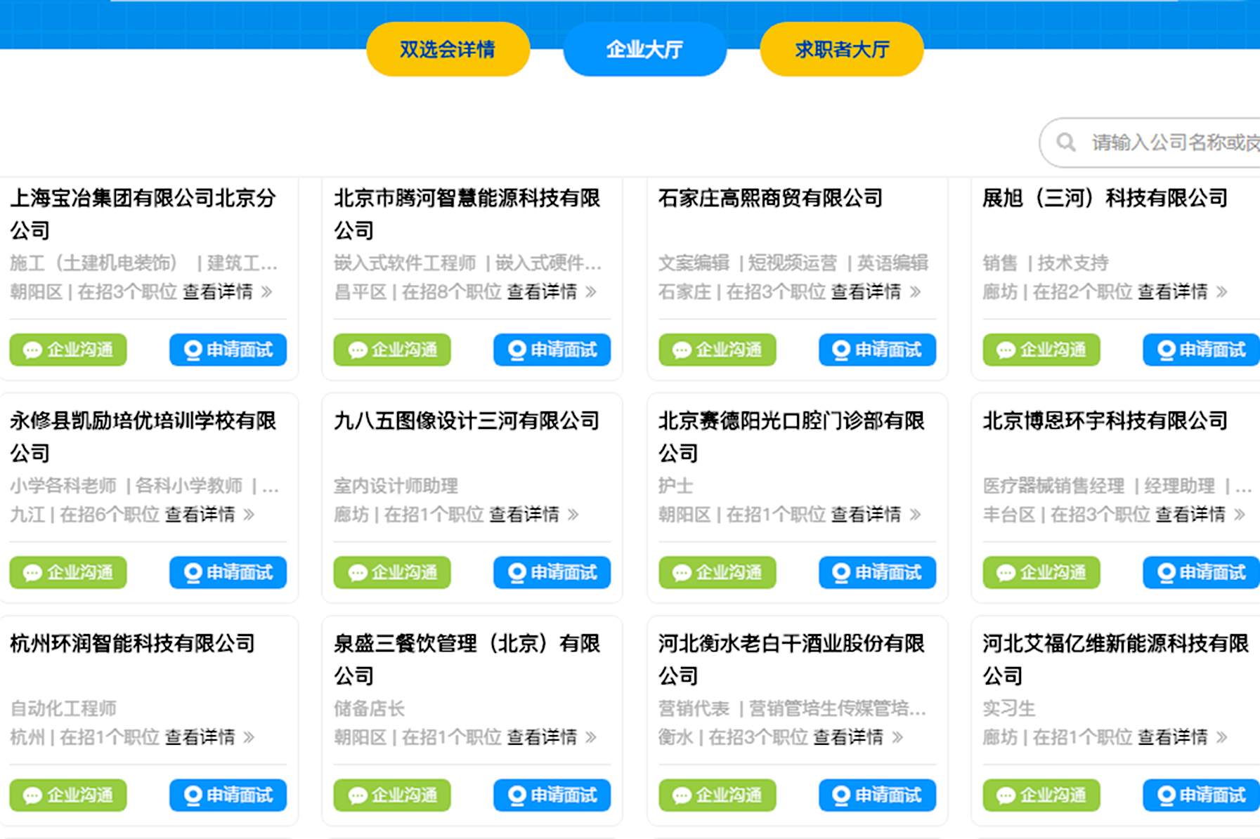 此次网络视频双选会精选了来自北京、天津、河北、江西、浙江等全国多个省(市)的176家用人单位参会,提供就业岗位10437个,涵盖信息技术、高端装备制造、新材料、生物化工、新能源等新兴产业以及教育培训、金融、建筑等多个传统行业,需求专业基本覆盖了2021届毕业生所有专业,为广大毕业生提供了充分的选岗空间。参会企业多是上海宝冶集团、北京城建集团、二十二冶集团、青岛啤酒、旭阳化工、北京金隅、九江线材、超星集团等世界500强、中国500强企业。
