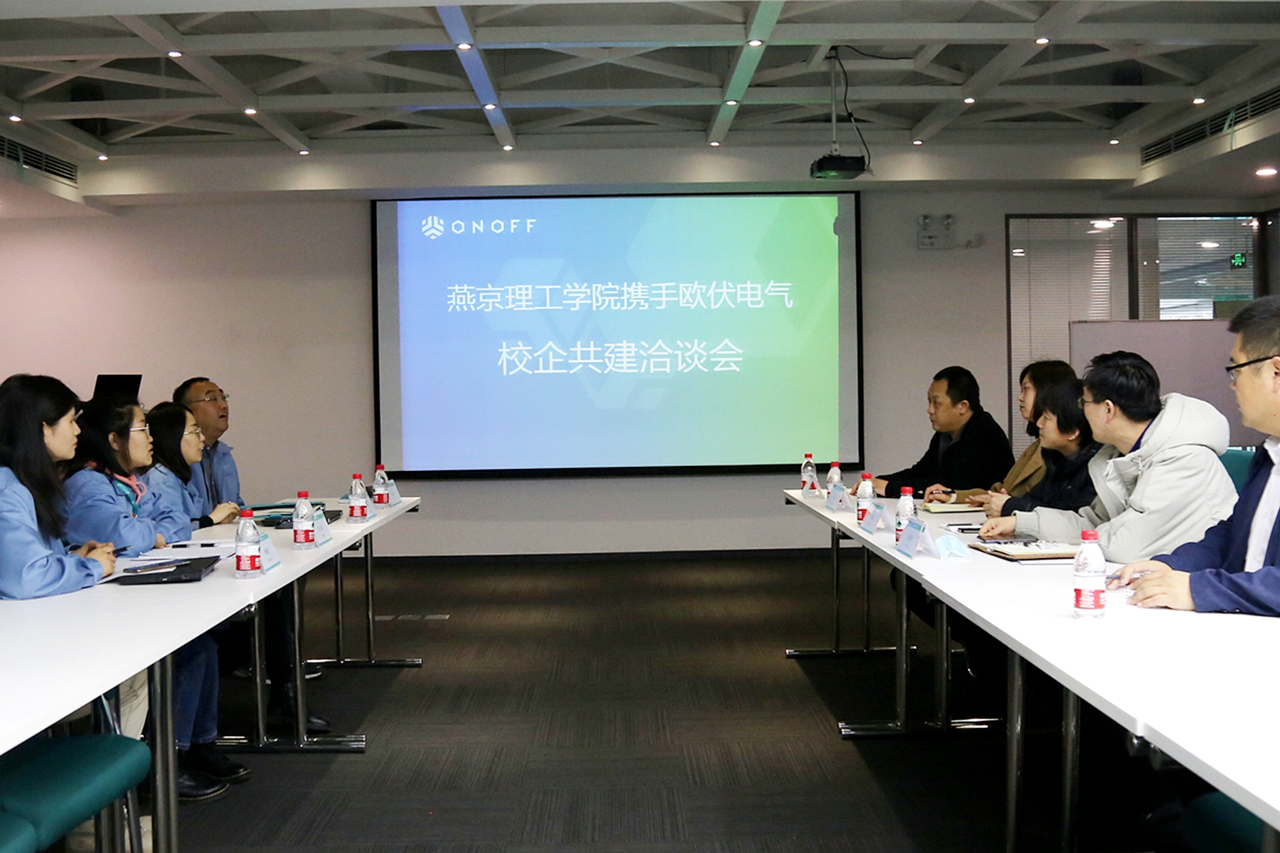 在校企共建洽谈会上,欧伏董事长陈红卫介绍了公司的发展历程和业务领域,人事经理刁英翠讲解了公司的招聘计划,说明了在欧伏工作的燕理毕业生的概况。李院长一行人在了解欧伏电气对于实习基地的建设方案后,对欧伏电气公司的成果表示肯定和赞扬。经过实地考察和会议讨论,了解到公司的实际用人需求,学校计划在学生开学返校后召开“双选会”,探讨学生短期和长期的实习方式。