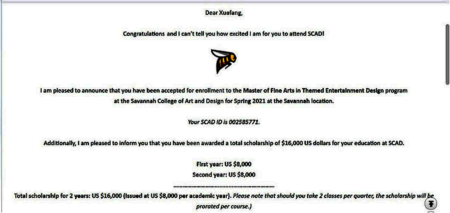 “乾坤未定,你我皆是黑马;乾坤已定,让我们扭转乾坤”。艺术学院环境设计专业17级优秀毕业生李雪芳成功收获美国萨凡纳艺术与设计学院(SCAD)室内设计方向和英国金斯顿(kingston)室内设计方向研究生offer。经过深思熟虑,她选择美国萨凡纳艺术与设计学院,成功获其$16,000US全额奖学金。