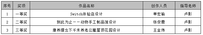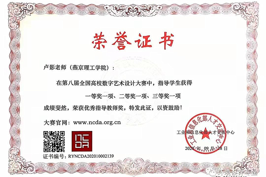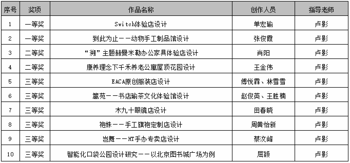 环境设计专业教师卢影将此次竞赛与《商业空间设计》课程结合,指导并组织学生参赛,检验想法与技法的熟练运用。最终荣获3组国家级奖项,包括一等奖1组,二等奖1组,三等奖1组。在华北赛区中荣获10组奖项,包括一等奖2组,二等奖2组,三等奖6组。卢影老师获优秀指导教师奖。