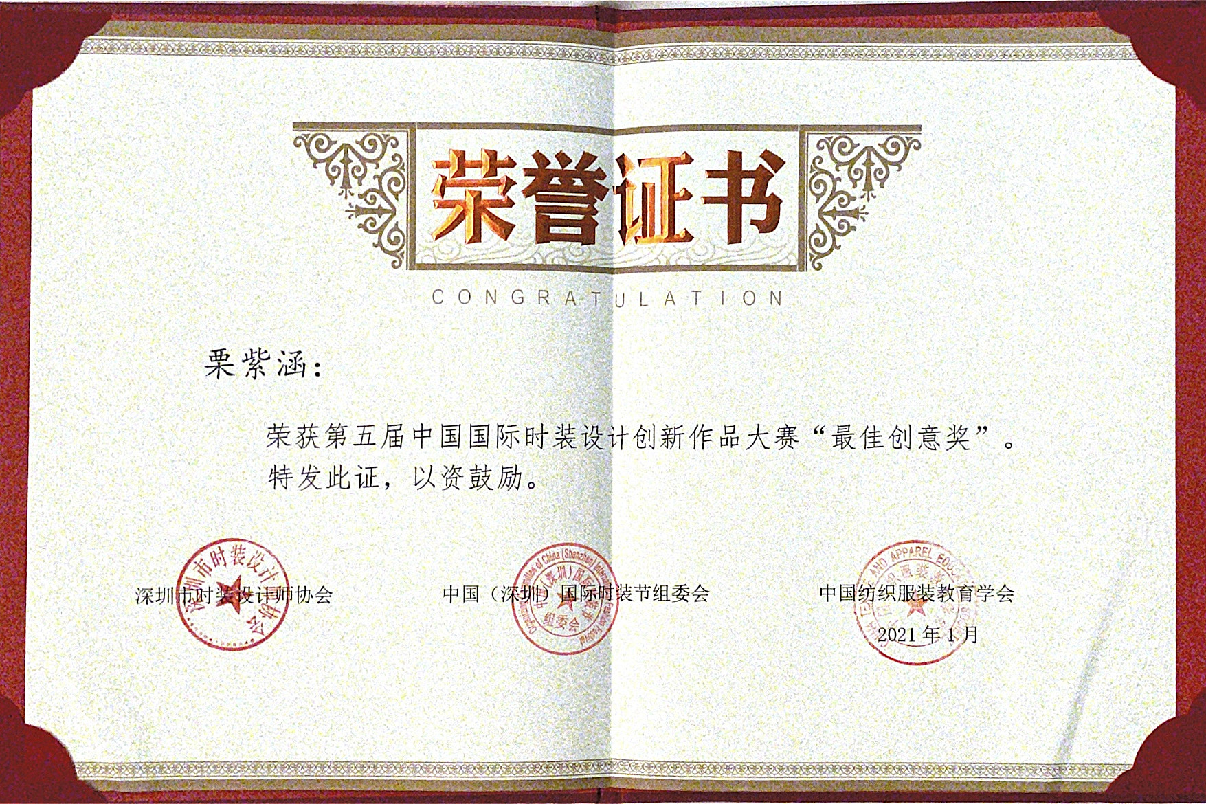 第六届中国(深圳)国际时装节于2021年1月1日-1月2日在广东深圳举行,本次时装节主要分为第五届中国国际时装设计创新作品大赛与第五届中国大学生服装模特大赛两部分,时装大赛与模特大赛由中国纺织服装教育学会主办,属于专业级学科竞赛。艺术学院服装与服饰设计专业栗紫涵、孙硕分别斩获中国国际时装设计创新作品大赛“最佳创意奖”、中国大学生服装模特大赛“铜奖”两项大奖。