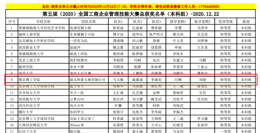 2020年12月20日,第五届(2020)全国工商企业管理技能大赛总决赛在线上举办。燕京理工学院共有七支队伍参加了此次比赛,并取得多个优异的奖项,其中会计学院注会2004班的李涵雯和国际商学院物流2001班的马玉佩及戚嘉诚组成的一队获得了本次国赛特等奖的佳绩。由会计学院注会1901班吴佳仪和注会1906班杨慧以及注会1902班侯文博组成的二队获得了国赛一等奖。其余五支队伍皆取得国赛三等奖的成绩,闫博老师荣获优秀指导教师奖。燕京理工学院在此次比赛中创下佳绩,刷新了之前在该比赛中取得的成绩,再创新高。