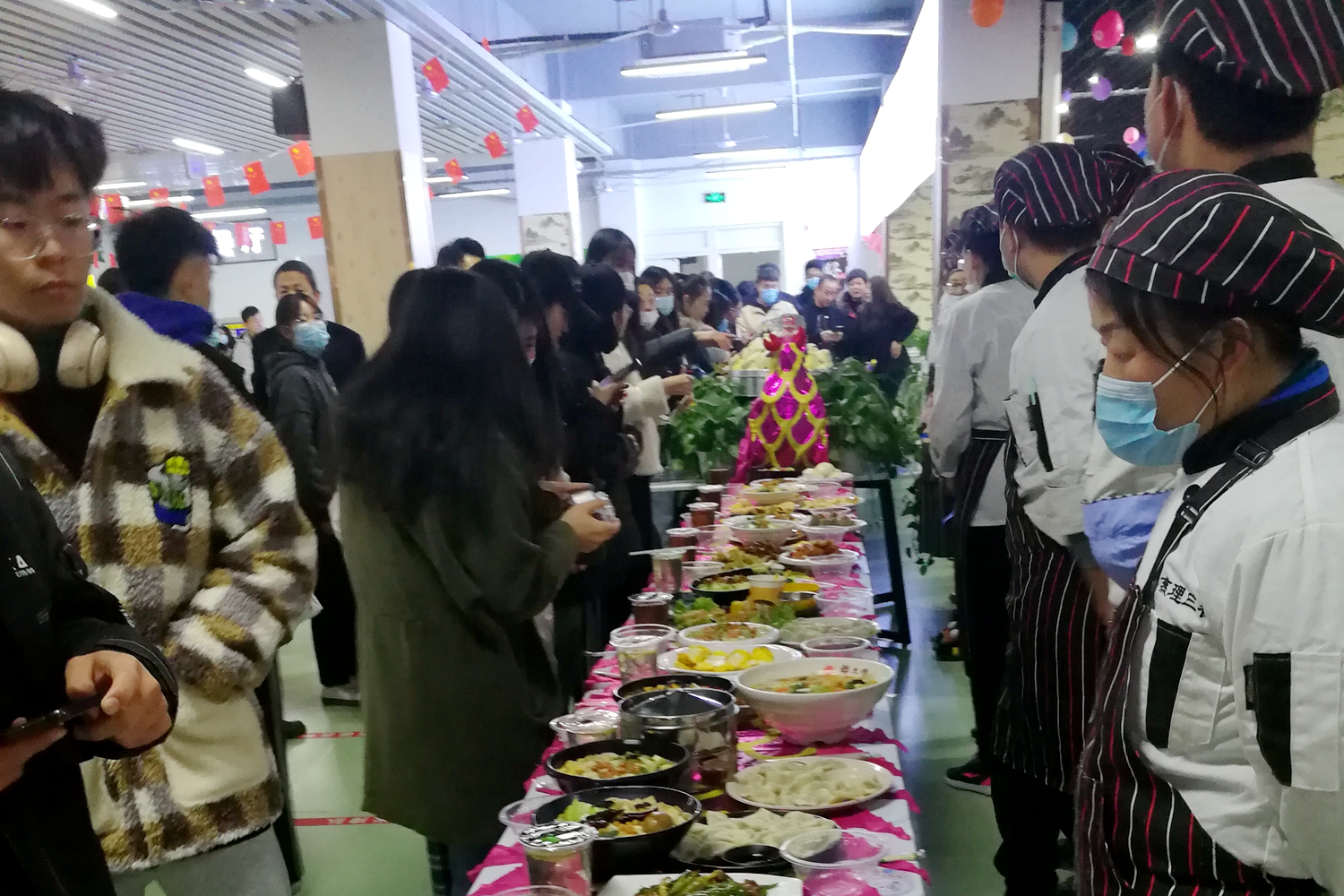 “长龙宴”是南方传统宴客方式,从“龙头”吃到“龙尾”,寓意事事顺心、平安幸福。燕理“长龙宴”长近30米,28位厨师亲手烹饪了鲁菜、川菜、粤菜、西北菜、东北菜等各种地方风味及特色小吃100余道,通过“长龙宴”充分展示出餐厅的各类风味特色餐品,让同学们品尝,让同学们评价,其中包括适合冬季的“羊蝎子”火锅、武汉的“热干面”、新疆的“大盘鸡”、陕西的“油泼面”、广东的“肠粉”、东北的“烤冷面”等,各地小吃美食数不胜数,让来自全国各地的同学们在学校也能品尝到家乡的味道,缓解同学们的思乡之情。厨师们在现场介绍自己窗口的参展菜品,与师生交流,虚心听取大家的意见。同学们表示,第一次品尝“长龙宴”感觉很兴奋,也很温馨,为学校在餐饮方面的精雕细琢点赞。