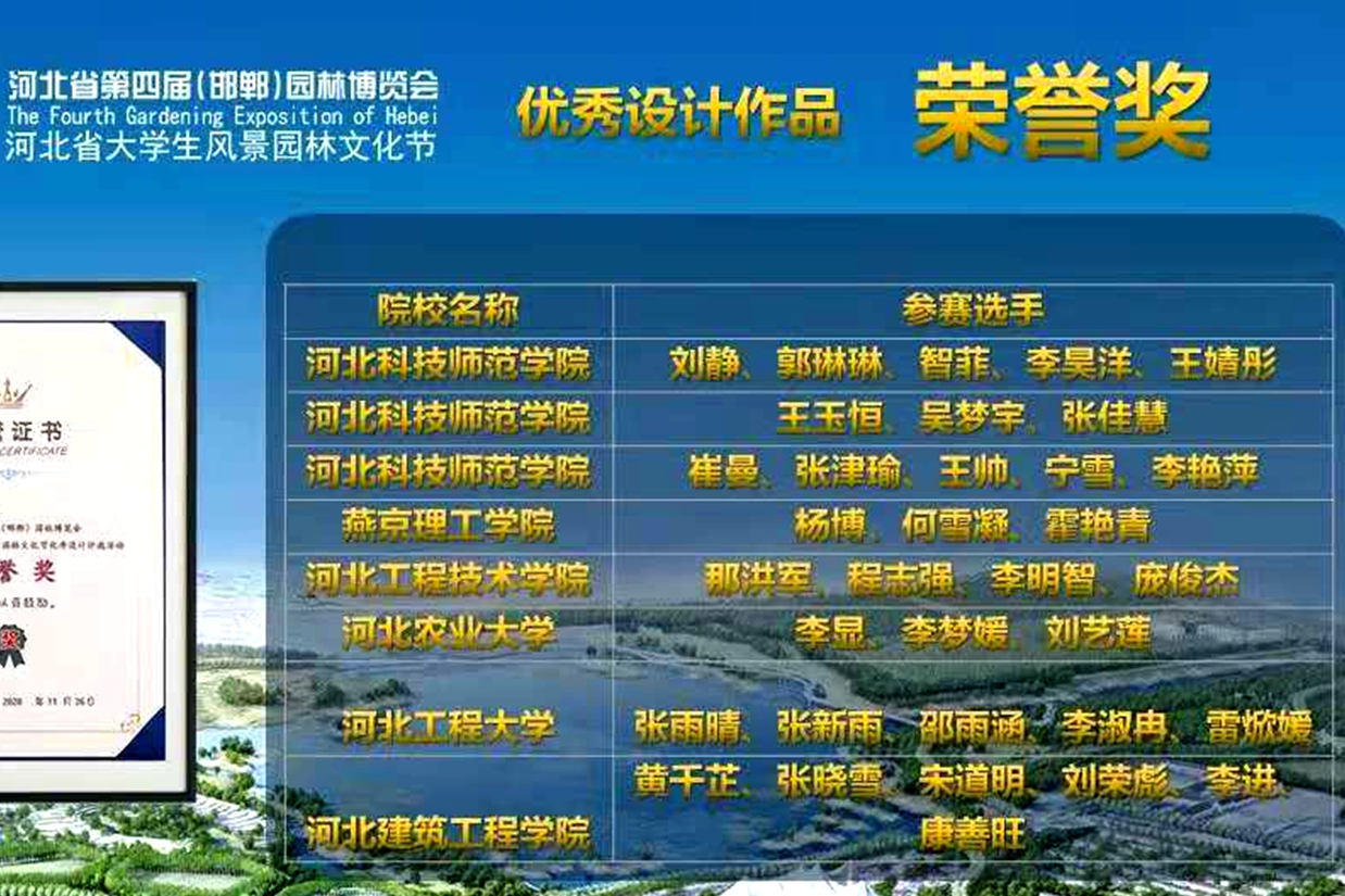 河北省园博会今年首次举办了设计营活动,邀请国内外知名专家指导师学生设计。活动发布以来,共有42组作品参赛,经初审,14个作品入围晋级,专家根据创意性、艺术性、科学性、可持续性标准进行打分,经过激烈的角逐,燕京理工学院建筑学院学子杨博、何雪凝、霍艳青获得荣誉奖。