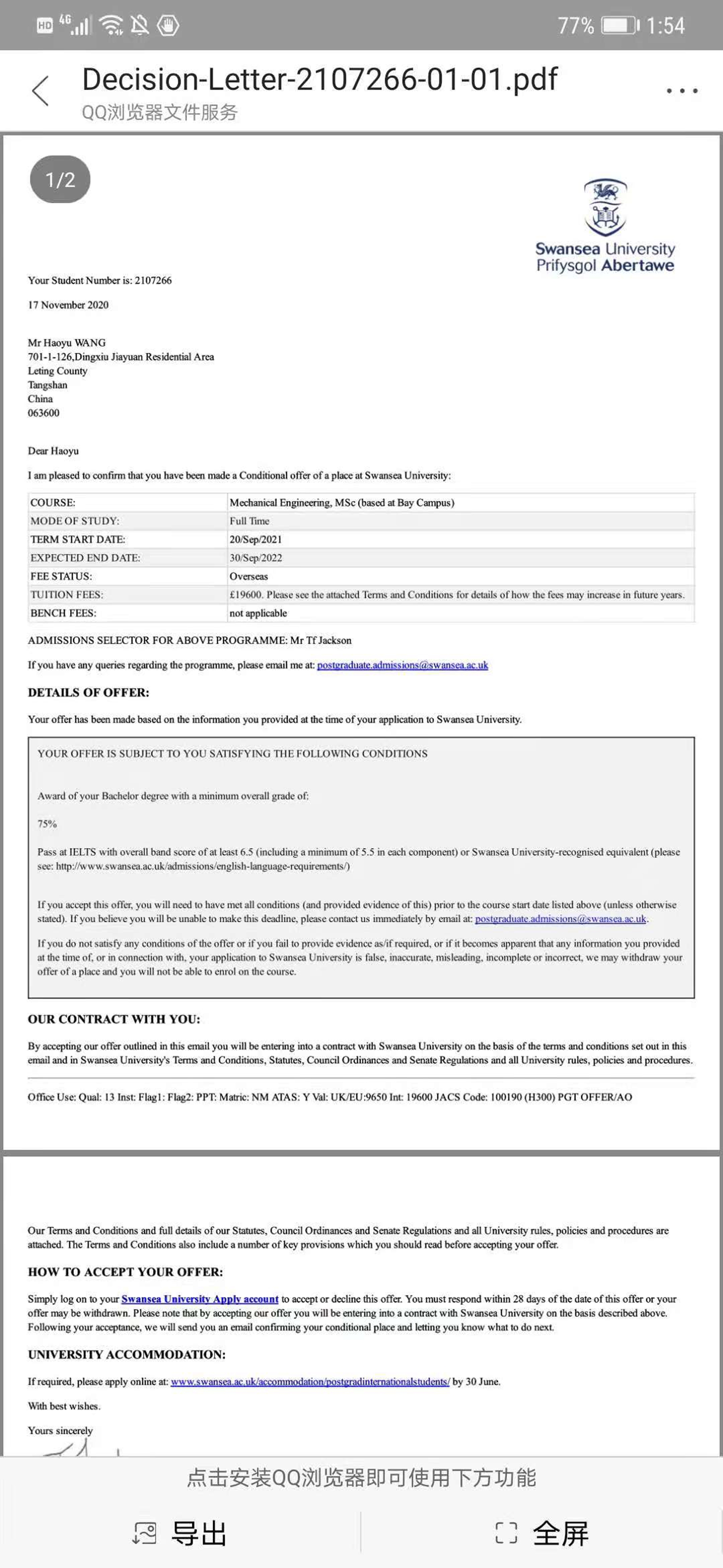 本硕直通国际班的王浩宇荣获拉夫堡大学和斯旺西大学机械工程专业offer。王浩宇表示,在燕理的生活为他的发展提供了大平台,在这里,诸如交际、沟通、协调、组织能力都得到了锻炼。这三年来,最大的变化就是更相信自己,大一的时候,自己对什么都好奇但却不敢尝试,到后来看见什么都相信自己能够做到。因此,当有出国意向的王浩宇了解到学校拥有本硕直通项目时,便从大一开始就踏上了追梦的旅程。