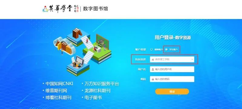 输入用户名和密码,点击登录,进入英华学堂数字图书馆界面。