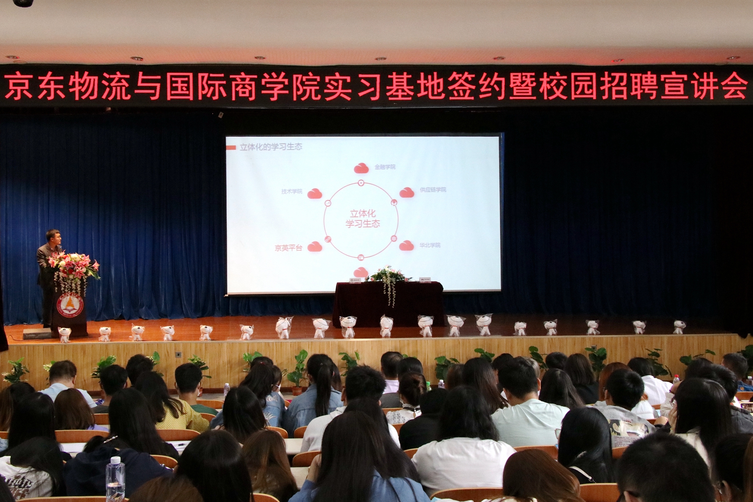 宣讲会现场在京东物流宣讲会现场,国际商学院副院长廉国恩与京东物流华北区B2B供应链管理部人力资源负责人阳丽平进行了实习基地签约,为学生实习提供了更多选择。京东物流华北区仓储部通州园区人资负责人薛志强等负责人现场宣讲,针对京东物流的运营模式及职业发展理念向同学们进行详细讲解。京东物流(JDL)隶属于京东集团,以打造客户体验最优的物流履约平台为使命,通过开放、智能的战略举措促进消费方式转变和社会供应链效率的提升,将物流、商流、资金流和信息流有机结合,实现与客户的互信共赢。