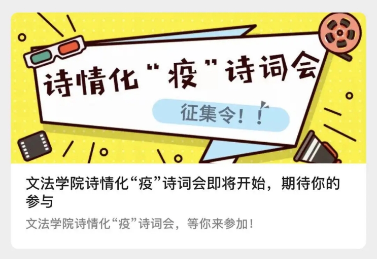 疫情发生以来,文法学院通过网络媒体平台组织丰富多彩的线上学生活动,引导学生健康防疫,缓解居家焦虑情绪,积极开展思想引领。期间,辅导员张琦老师组织开展了诗情化“疫”抗击疫情主题诗词会,汉语言文学专业同学凭借专业特点和优势,以家国情怀的高度、深度和温度,创作诗词,致敬逆行者,传递正能量,为战疫助力,向祖国告白。