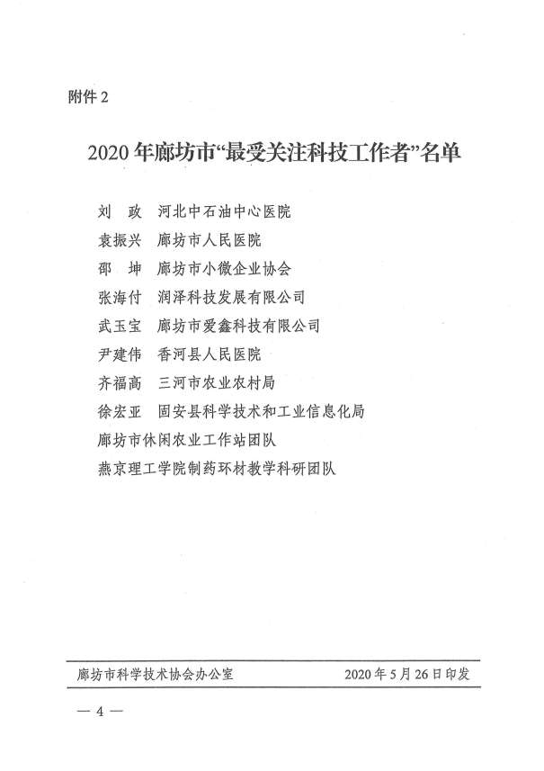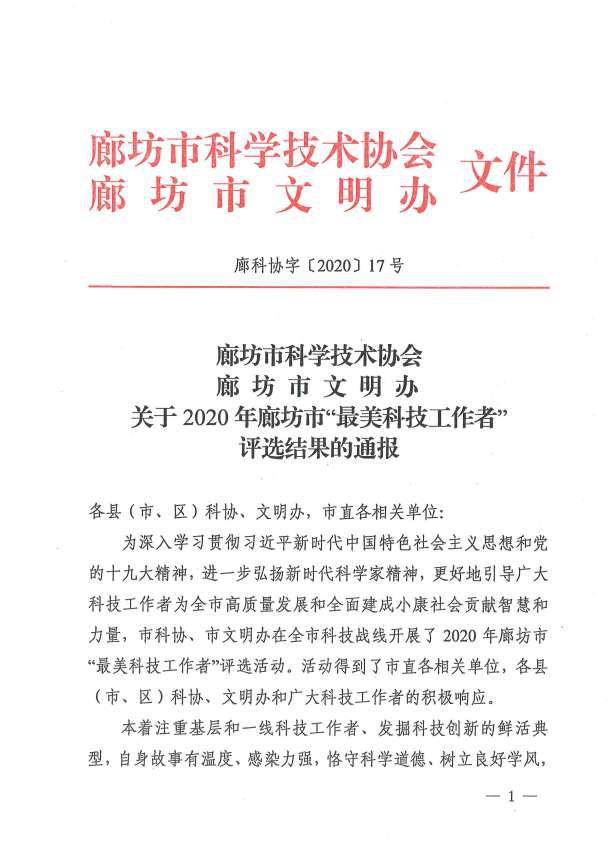 廊坊市“廊坊市最美科技工作者”评选通报文件