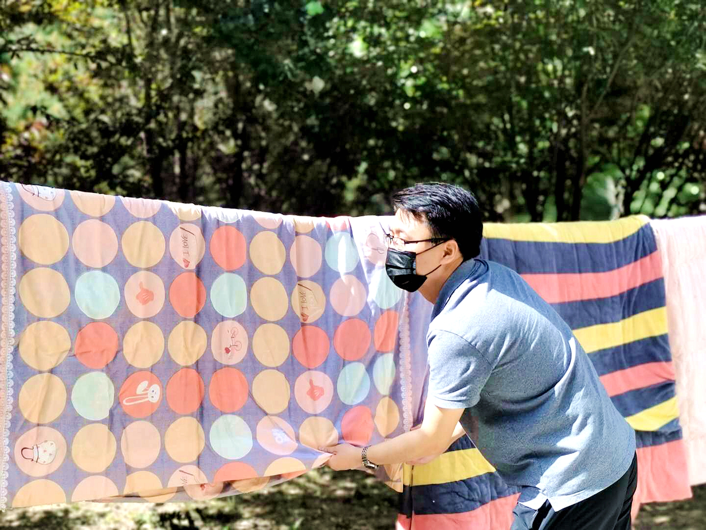 上午9点,传媒学院全体辅导员老师在学院党总支书记的带领下来到了已经预约“云晒被”的公寓楼为同学们整理宿舍、晾晒被褥。老师们根据同学在网上预约情况登记宿舍号床位号,在被子上做好标记,保证凉晒回收后能够正确归位。为保证同学们被子的清洁,在晒被子之前,老师们将晾衣绳上的灰尘拭去。在把被子放到晾衣绳上之后,反复拍打被子,为同学清理被子上的尘土。下午2点,老师们将被褥收回,并整理好同学们的床铺。