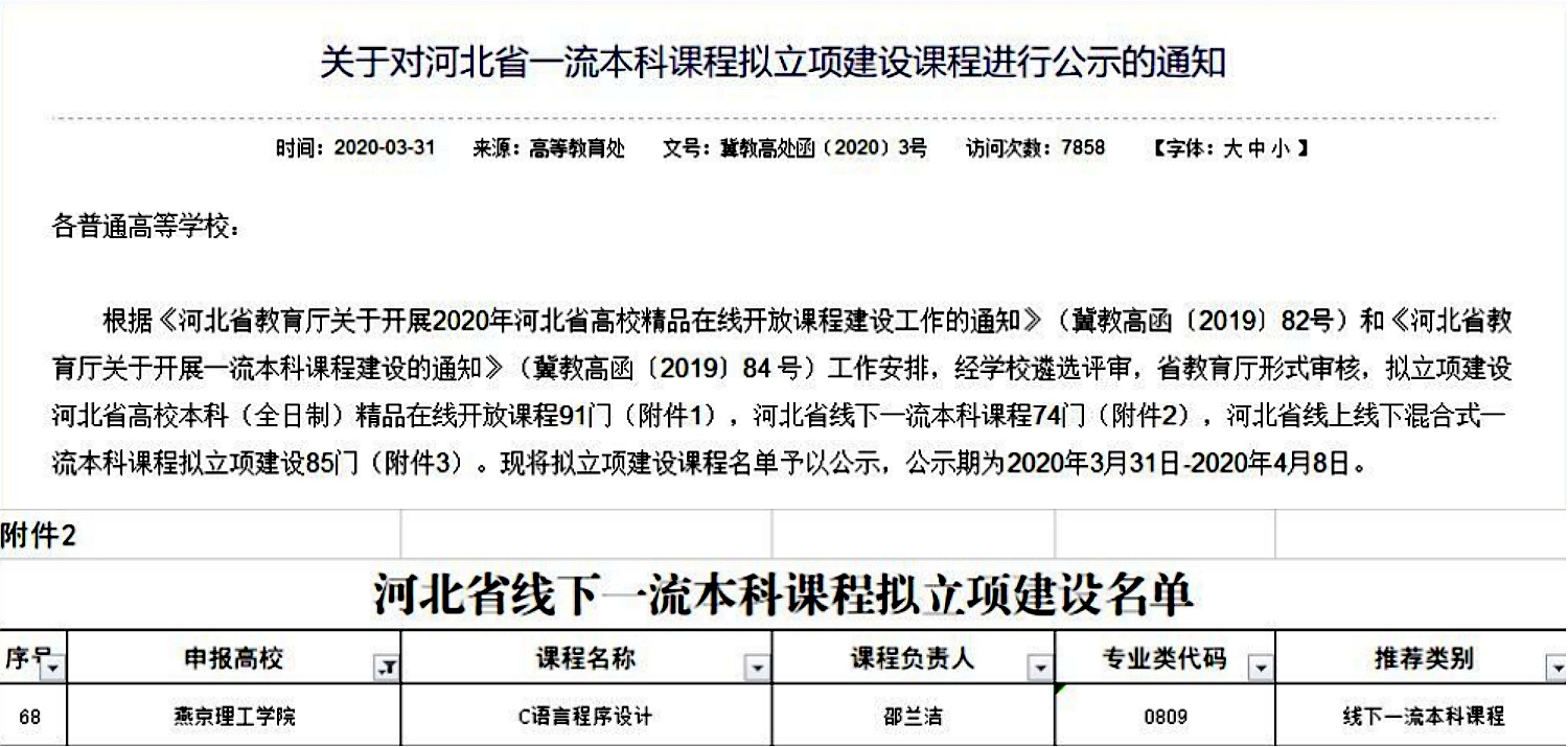 近日,河北省教育厅发布《关于对河北省一流本科课程拟立项建设课程进行公示的通知》,公布了拟立项建设课程名单,信息科学与技术学院邵兰洁老师的《C语言程序设计》课程入选河北省一流本科拟立项建设课程。