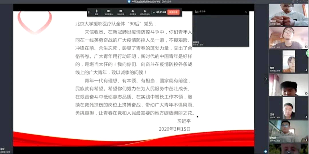 近日,信息学院学子们通过网络在线研读了中共中央总书记、国家主席、中央军委主席习近平给北京大学援鄂医疗队全体“90后”党员的回信,并以在线发言、书写心得等多种形式,对回信进行的深入交流和学习。