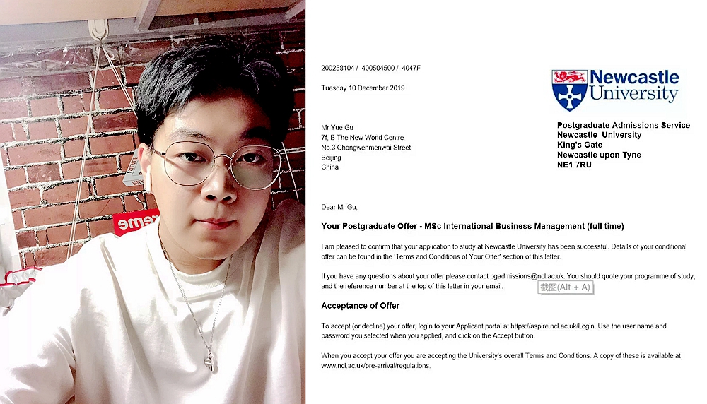 会计学院会计专业谷越同学收到了纽卡斯尔大学的offer。
