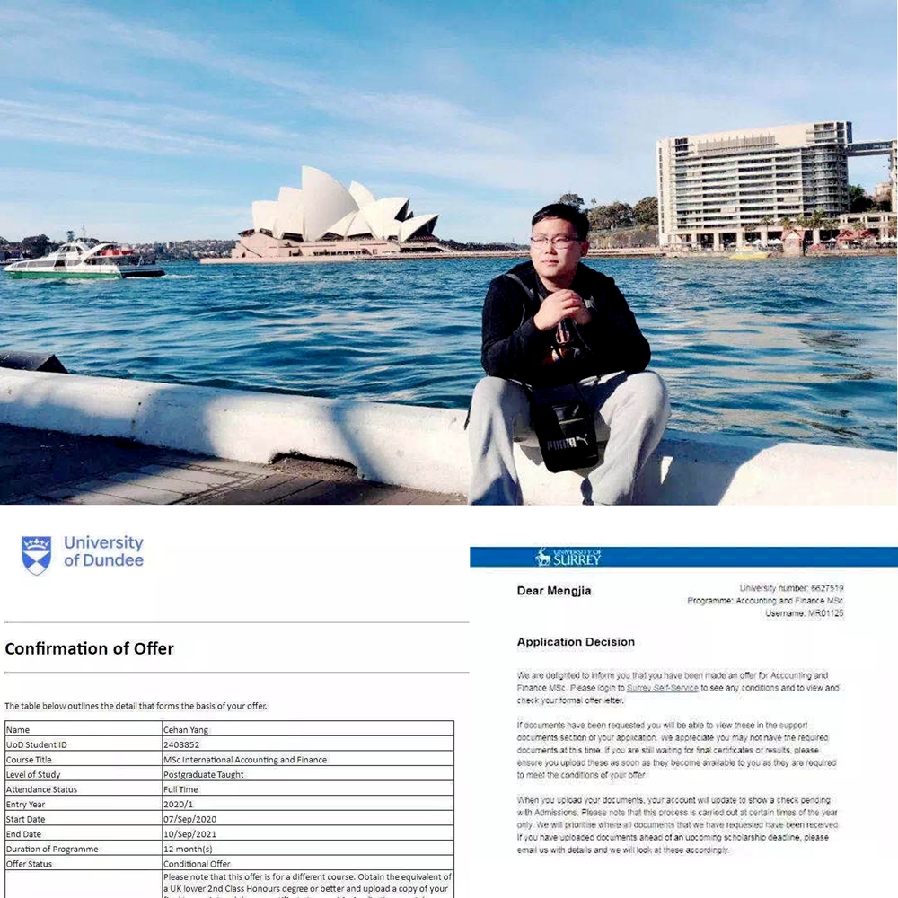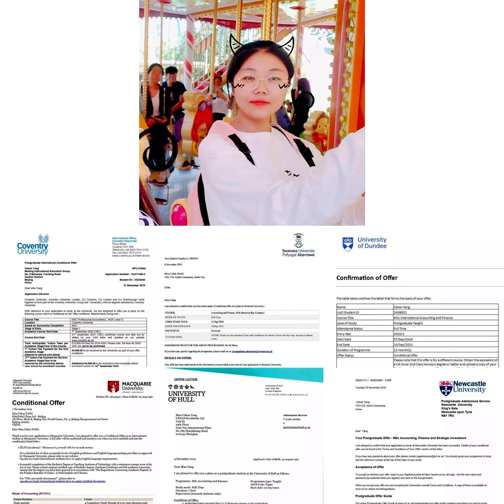 会计学院会计专业杨策涵同学收到了纽卡斯尔大学、斯旺西大学、赫尔大学、邓迪大学、莫纳什大学、考文垂大学、麦考瑞大学的offer。